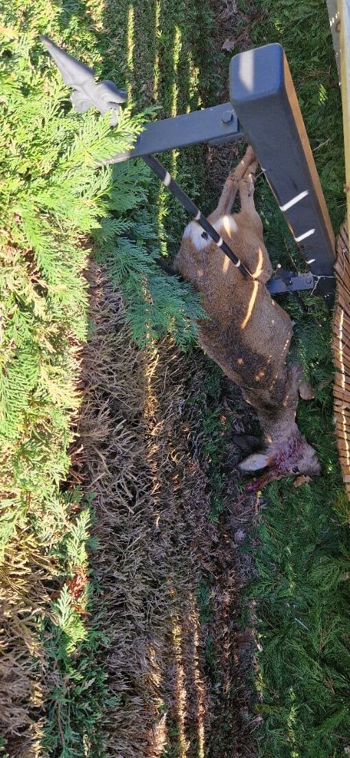 DUBBELE PECH VOOR REEBOK : Dinsdagochtend kreeg een chauffeur Jeroen van ons WTT een oproep om te gaan kijken naar een aangereden reebok in Gelrode (Vlaams-Brabant) : niet ons werkingsgebied normaal, maar daar er in Vl.-Brabant geen WTT is en wij dicht bij de grens een gemotiveerde vrijwilliger hebben, is die erop af gegaan. Tijdens zijn rit ernaartoe krijg hij al melding van de eigenaars van de tuin waarin de reebok lag, dat hij was opgestaan en was gaan lopen. Bij aankomst heeft onze chauffeur de reebok gevonden, dood, gespiest aan de pieken van een tuinhek. Een gezonde ree zou er waarschijnlijk zonder moeite overheen kunnen springen, maar suf van de klap tegen de auto is deze bok er tussen willen kruipen en vond hij een akelige dood. Dus mensen, als je een tuinhek wilt plaatsen, zeker als je 'op den buiten' woont, denk goed na over welk soort hek je kiest. Geen moordwapens !