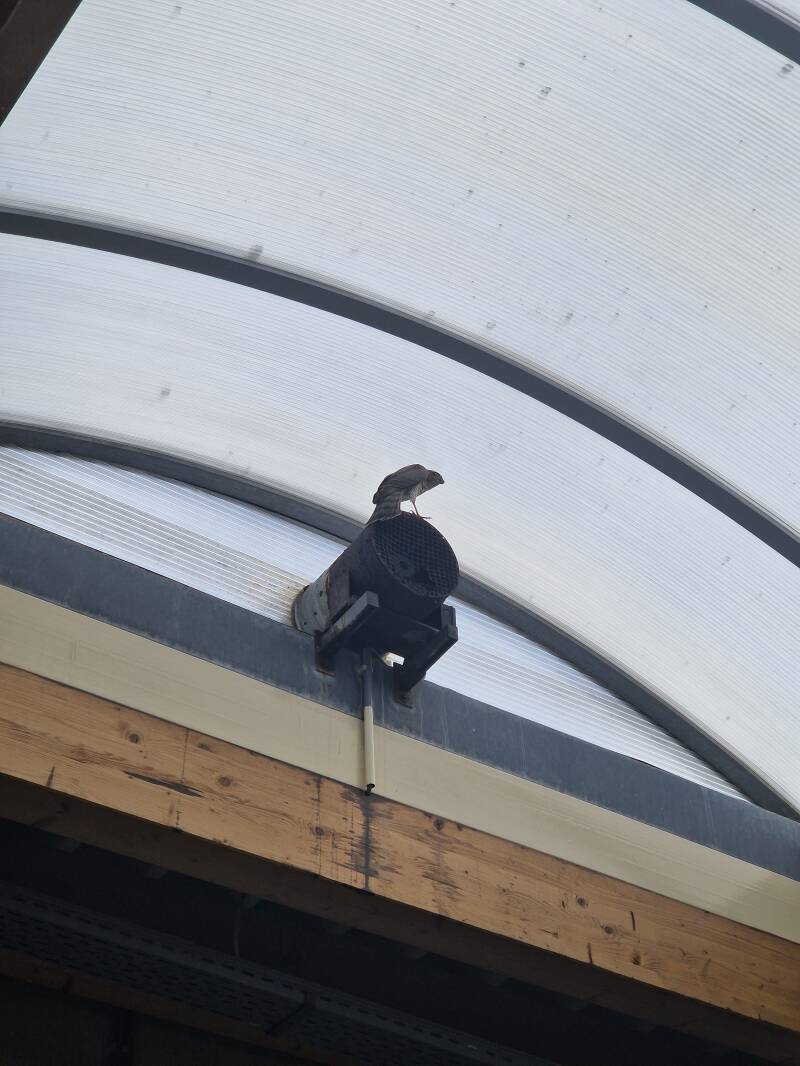 Een vrijwilliger vertrok meteen ter plaatse. Het magazijn was ruim vier meter hoog — te hoog voor onze standaard vangnetten. Gelukkig bleek het gebouw een magazijn van een vissenwinkel te zijn, waar langere schepnetten beschikbaar waren. Die kwamen uitstekend van pas: met wat geduld en samenwerking kon de torenvalk relatief snel gevangen worden.