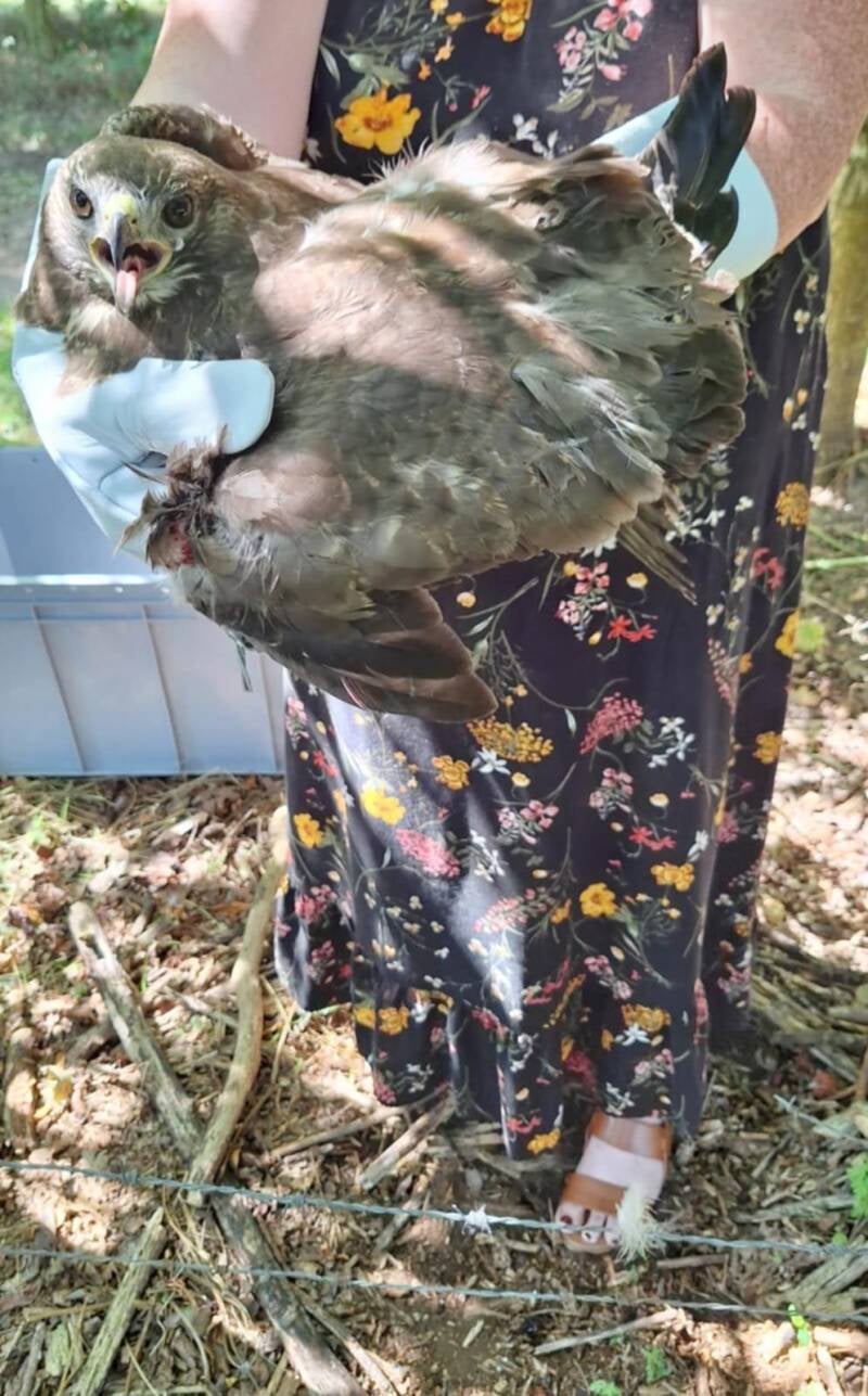Maar onderweg kwam er al snel een nieuwe oproep binnen: in Lummen zat een buizerd vast in prikkeldraad, waarbij de vleugels verstrikt waren geraakt. Vrijwilligster Sandra vertrok meteen richting de melding. Ter plaatse bleek de vogel gewond te zijn aan de vleugels. Na bevrijding uit het prikkeldraad bracht Sandra hem rechtstreeks naar VOC Neteland voor verzorging en herstel.