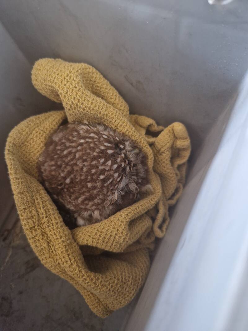 Bij aankomst werd de steenuil overhandigd door de security, die hem ondertussen veilig in een kartonnen doos had gezet. Al snel bleek dat de toestand ernstig was: de uil was extreem mager, het borstbeen stak scherp uit en de kroep (de voedselreserve bij vogels) was volledig leeg. Tijdens het hanteren kwamen er zelfs enkele vliegen uit de verendons tevoorschijn – een teken dat het dier al langere tijd verzwakt was en in slechte conditie verkeerde.