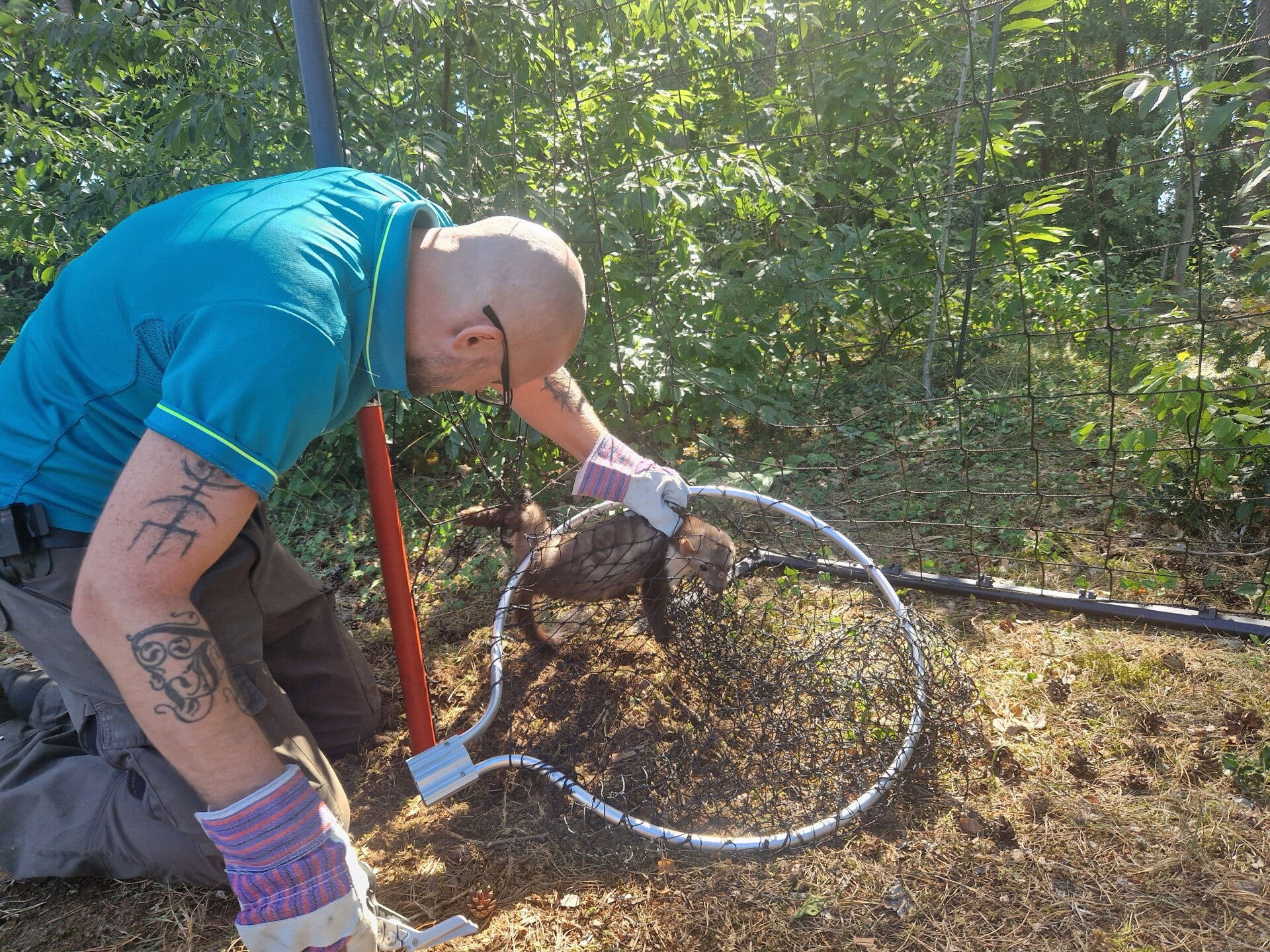 Het losknippen van het net was erg lastig, maar de vrijwilliger slaagde erin en behandelde de poot meteen tegen myiasis (madeninfectie). Daarna werd de marter zo snel mogelijk overgebracht naar VOC Neteland.